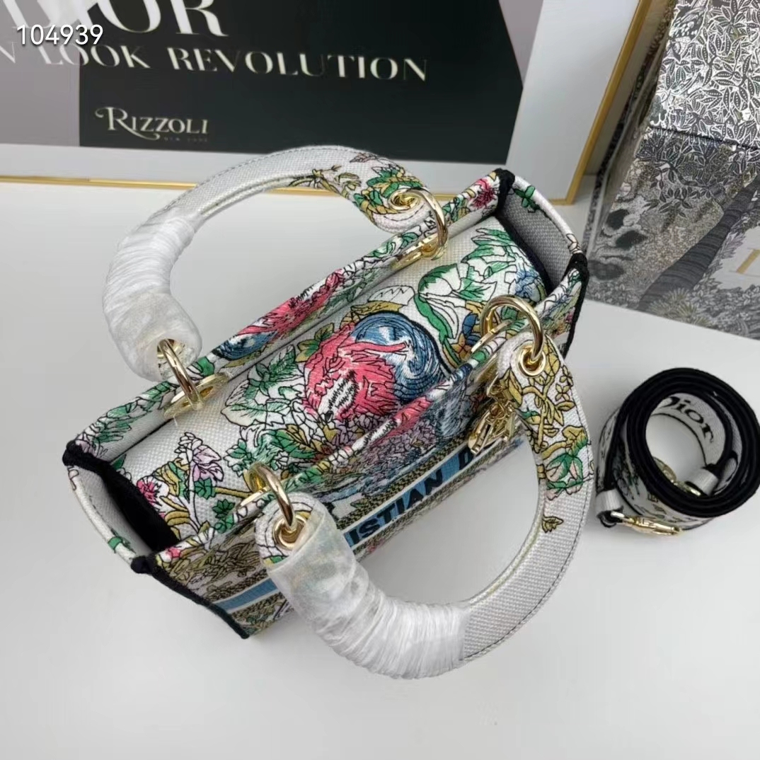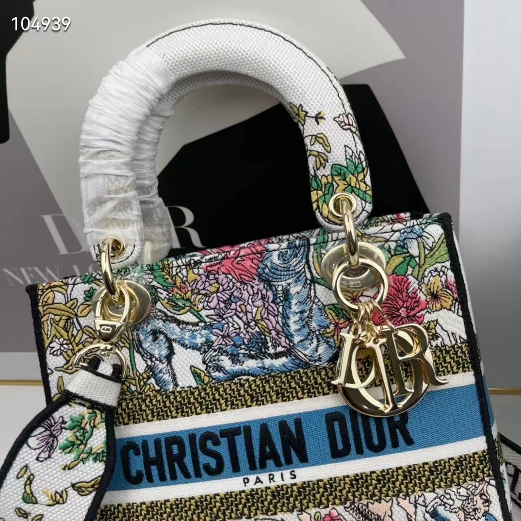 Featuring a wide. removable and reversible embroidered shoulder strap. the medium Lady D-Lite bag can be carried by hand or worn crossbody.