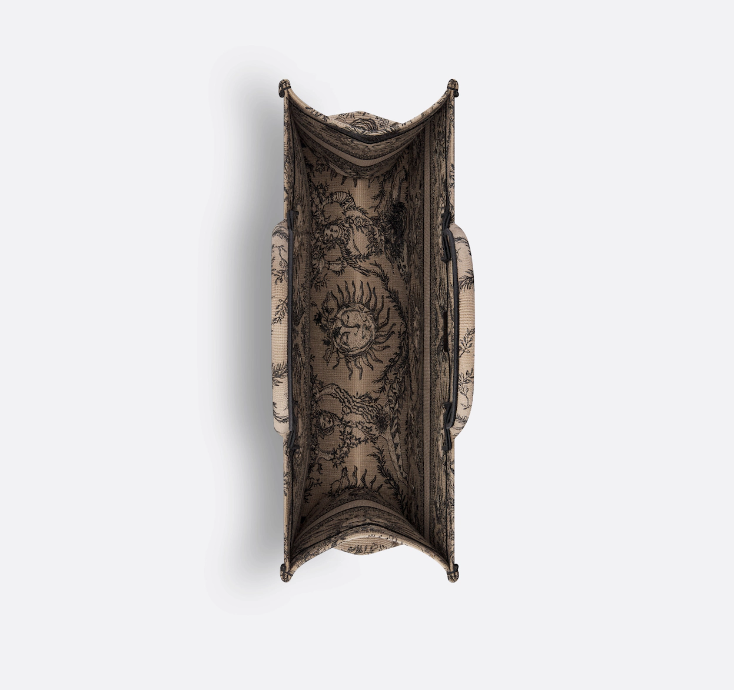Introduced by Maria Grazia Chiuri, Creative Director of CD, the D  Book Tote has become a staple of the D aesthetic. Designed to hold all the daily essentials, the style is fully embroidered with the season’s signature Toile de Jouy Soleil motif in beige and black, offering a new take on the iconic House motif with suns and crescent moons layered into a floral design representing the four seasons. Exemplifying House savoir-faire, the large tote is adorned with the CD Paris signature on the front, and may be carried by hand or worn over the shoulder.