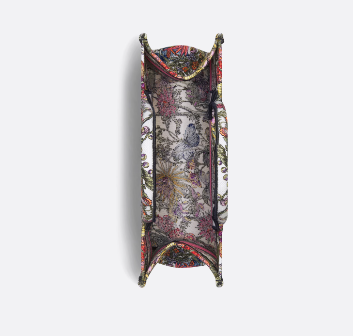 The D Book Tote is a House classic designed by Maria Grazia Chiuri, Creative Director of CD. Created to hold all the daily essentials, the style is fully embroidered with a white multicolor Mexico Millefiori motif by Pietro Ruffo, showcasing butterflies and Mexican flowers in an elegant and colorful spirit. Adorned with a contrasting CD Paris signature on the front, the medium tote exemplifies the House’s signature savoir-faire and may be carried by hand or worn over the shoulder.