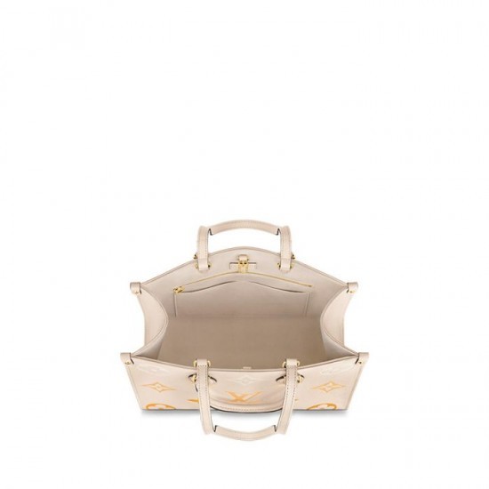 Made from a Monogram Empreinte leather with a subtle colour gradient on the embossed Monogram pattern. the emblematic OnTheGo MM tote bag is part of the By The Pool capsule collection. It has two sets of handles. long and short. for hand and shoulder carry and a spacious interior. which easily fits essentials such as a laptop. A leather charm gives a playful spirit and highlights the craftsmanship.