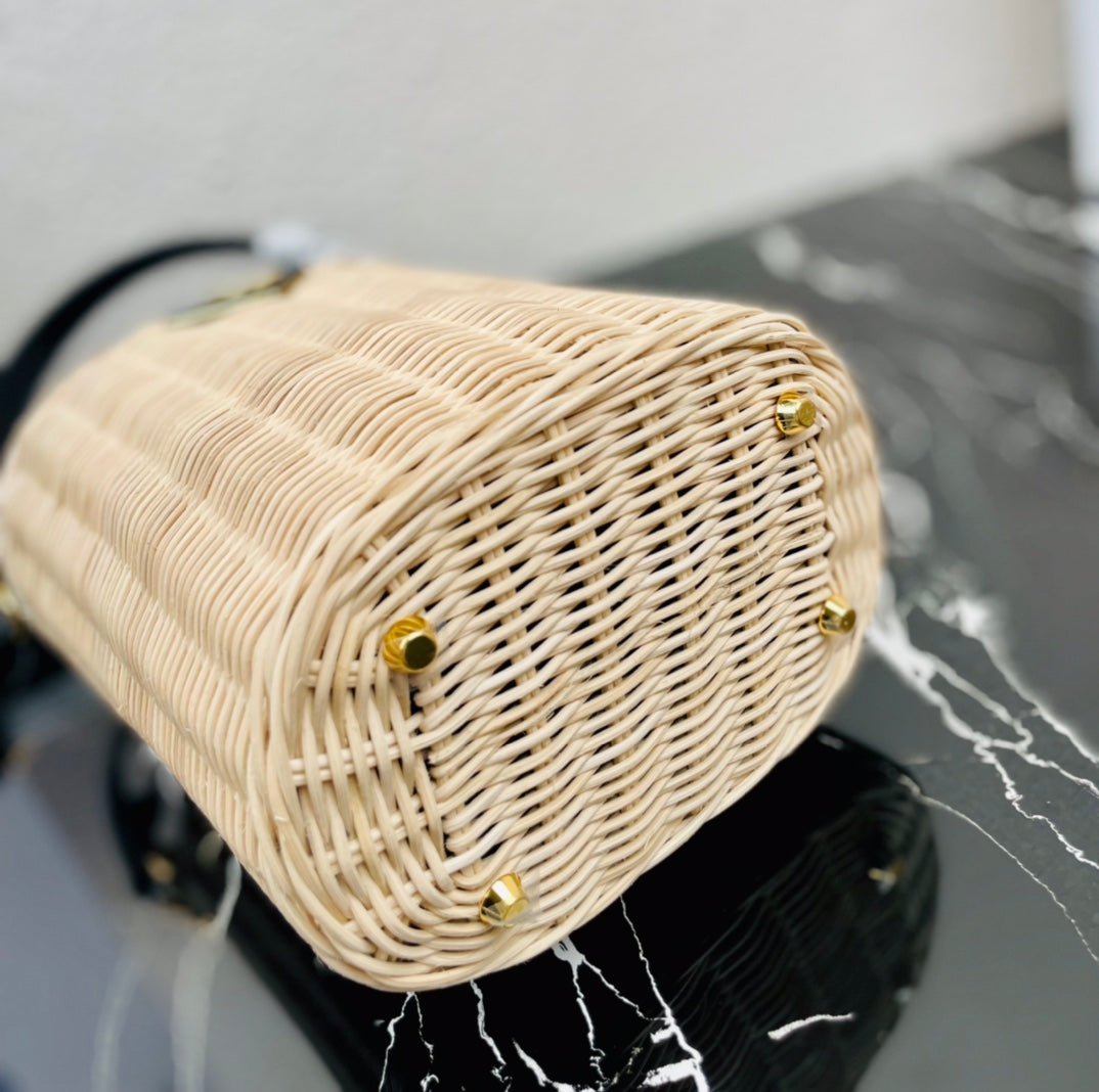 Prada Wicker And Canvas Bucket Bag TanBlack size 18x19x11 cm