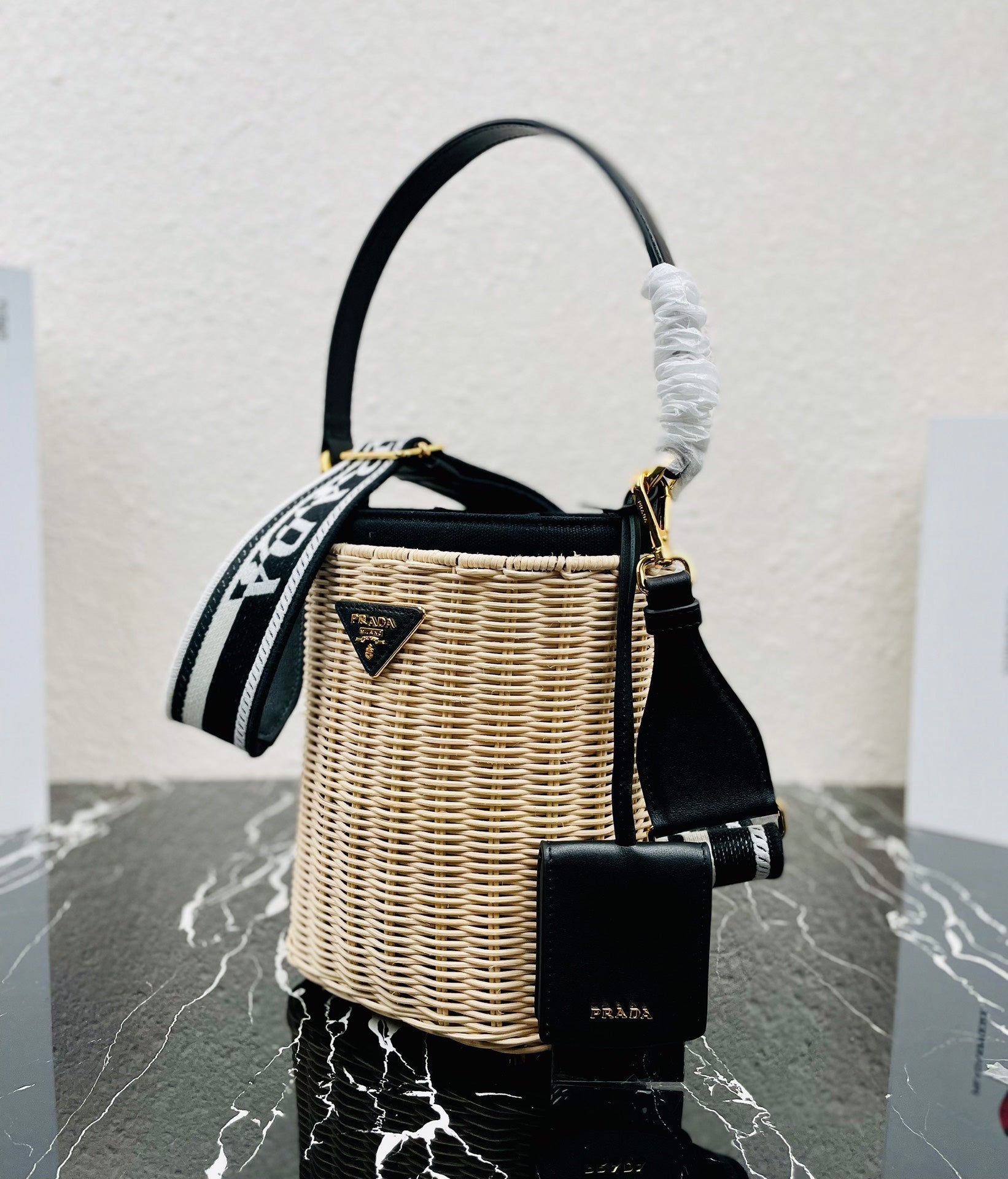 搶先評價 “Prada Wicker And Canvas Bucket Bag TanBlack size 18x19x11 cm”